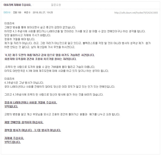 | Subject | "4·3추념식 연예인 참석 말라"…이효리 팬 카페에 올라온 글 |