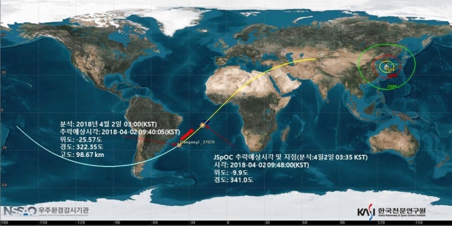 과학기술정보통신부는 "톈궁 1호가 한국 시간 2일 오전 7시 33분과 11시 33분 사이에 남아메리카 부근에 최종 추락할 것으로 보인다"고 1일 밤 밝혔다.