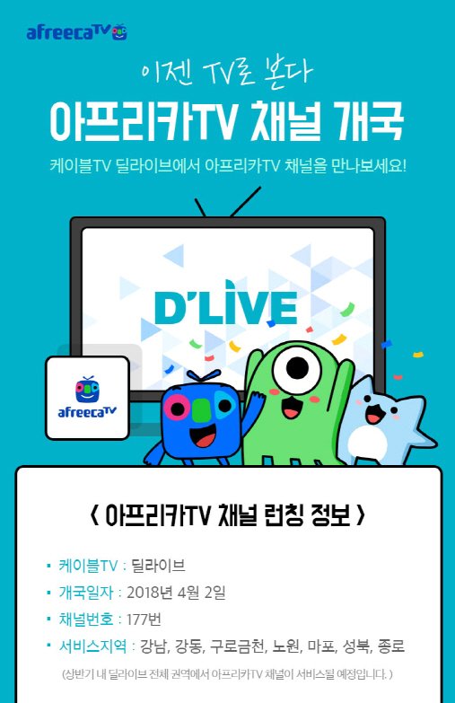 시청 가능 지역은 딜라이브 서비스 지역인 강남, 송파, 강동, 구로금천, 노원, 마포, 종로 등 7개 지역이다. 아프리카TV는 올해 상반기 내로 지역을 확대 송출할 예정이다. 딜라이브 OTT박스에 라이브 서비스도 동시에 진행한다.