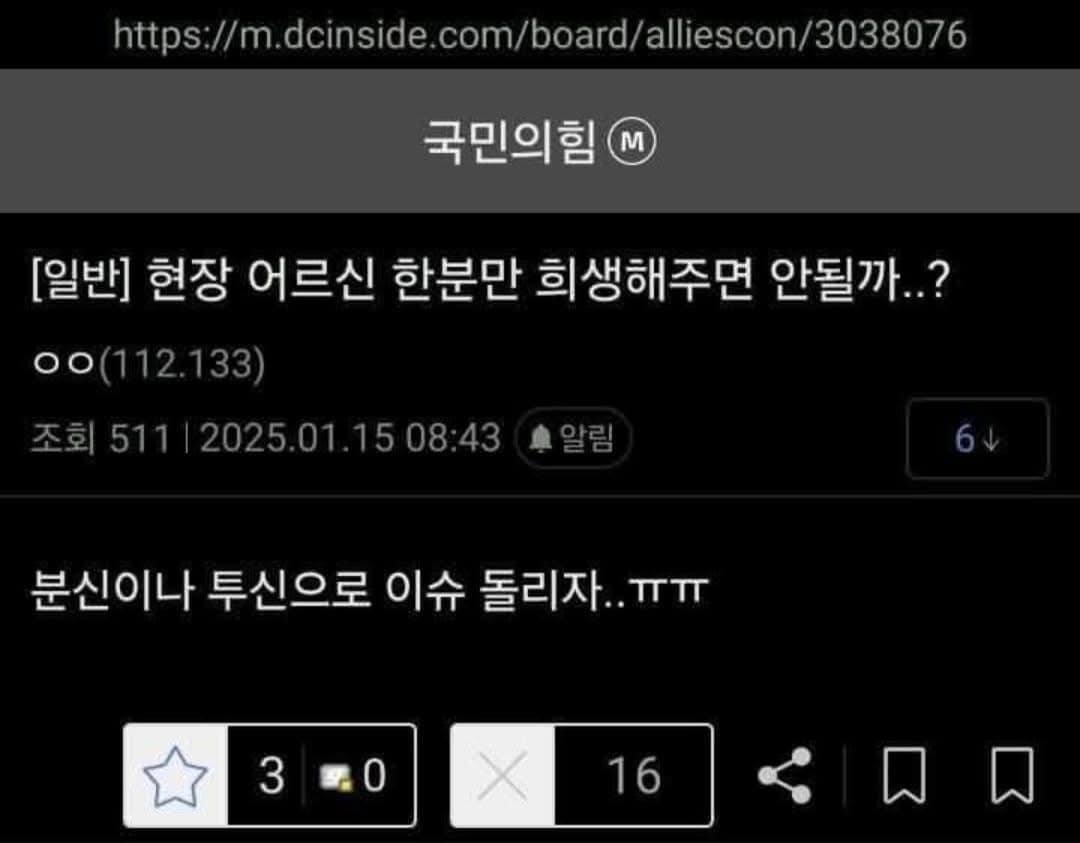 https://n.news.naver.com/article/421/0008024588?sid=102 정치가 뭔지, 대통령에 자신의 무엇을 빗대거나 기대하거나 동일시 하는건지 모르겠지만 분신이라는 행동에 그렇게까지 하게 된 복잡한 배경과 이유에 대해 관심이 가지만 이번 일은 많이 안타깝고 슬프네요. 인터넷 세상은 너무... 하... 0
