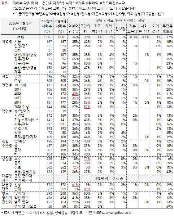 1043 정치국민의힘 39%·민주 36%…"계엄전 비등한 구도로 되돌아가"[한국갤럽] 16 the 25/01/17 3180 0