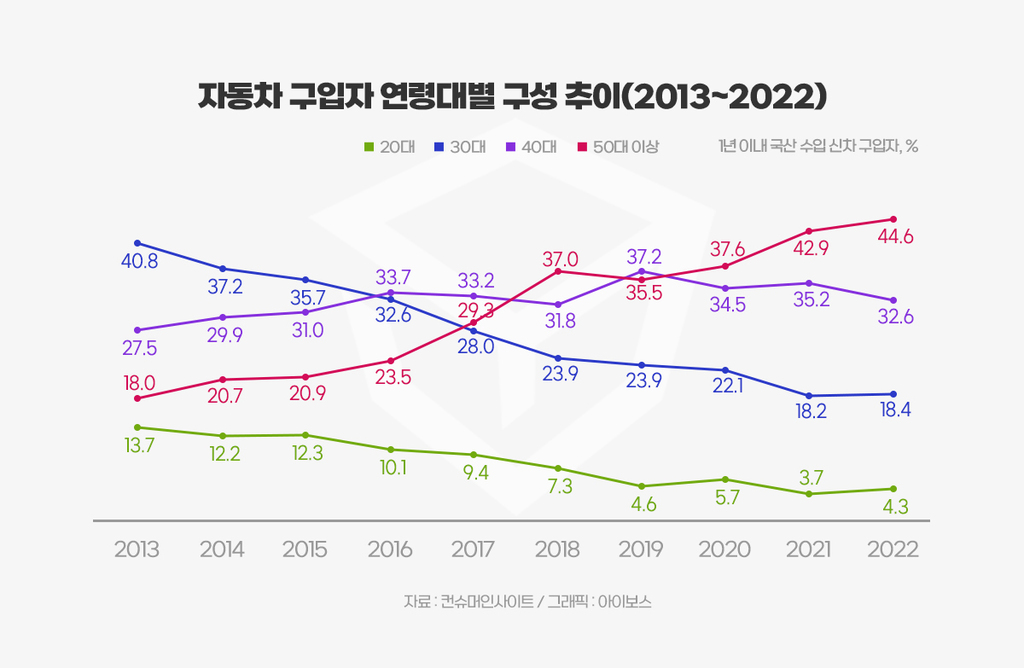 통상 준중형 세단을 많이 찾는 사회초년생들이 신차 구매를 줄인 것도 영향을 미쳤다. 한국자동차모빌리티산업협회(KAMA)에 따르면 지난해 1~11월 20대와 30대의 승용 신차 등록 비율은 전체의 5.4%, 14.2%로 관련 집계가 시작된 2009년 이래 가장 낮은 수준을 보였다... "취업난과 경기 불황으로 20~30대 신차 구매가 줄어드는 가운데 구매 여력이 있는 사회초년생들은 중형 세단이나 SUV로 넘어가는 추세"