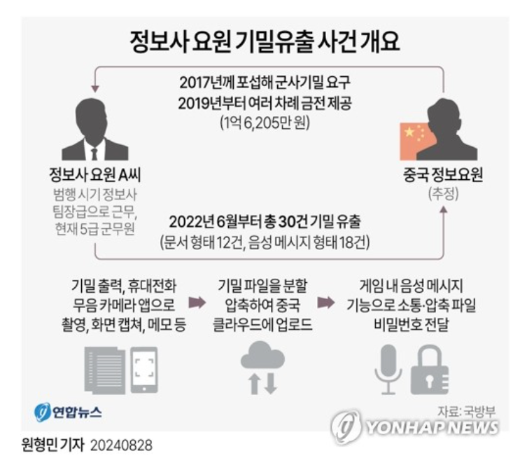 A씨가 빼돌린 자료는 문서 형태로 12건, 음성 메시지 형태로 18건 등 총 30건으로 확인됐다. 누설된 기밀에는 신분을 숨기고 활동하는 흑색(블랙) 요원 명단도 있었다.