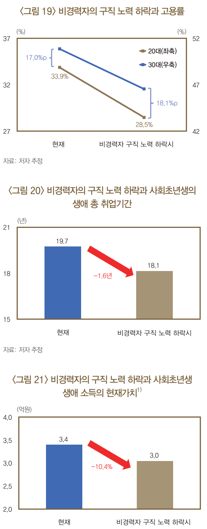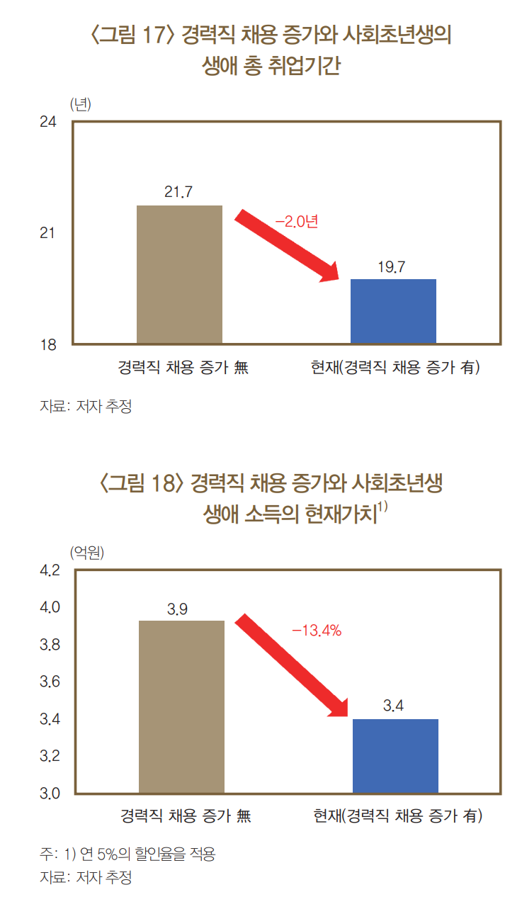 한국은행이 4일 펴낸 '경력직 채용 증가와 청년 고용' 제하의 BOK이슈노트 보고서에는 한은 조사국 고용분석팀 소속 채민석 과장과 장수정 조사역의 이 같은 연구 결과가 실렸다... 한국경영자총협회와 한국고용정보원이 기업 신규 채용 계획을 조사한 결과, 경력직 비중은 2009년 17.3%에서 2017년 30.9%, 2021년 37.6%로 급등한 것으로 나타났다. 문제는 노동시장에 갓 진입한 청년들이다. 특히 20대의 경우 이전 취업 경험이 없는 비경력자 비중이 커 취업 기회가 다른 연령층 대비 더욱 제한될 것으로 우려된다... ...첫 취업이 밀리자 사회초년생이 기대할 수 있는 생애 총 취업 기간은 평균 2년 단축(21.7→19.7년)됐다. 이로 인해 생애 총소득을 연 5% 금리로 할인한 현재 가치는 3억 9000만 원에서 3억 4000만 원으로 13.4% 낮아졌다. 여기에 경력직 채용 증가로 취업 기회가 제한되는 상황이 지속될 경우, 구직 포기 청년이 늘어나면서 악영향은 심화될 것으로 분석됐다. 연구진은 비경력자의 구직 노력이 30% 낮아진 경우를 모형으로 시뮬레이션한 결과, 20대 청년 고용률이 현재보다 5.4%p 낮아지면서 30대와의 격차가 1.1%p 확대되고 생애 총 취업 기간은 1.6년 더 줄어들면서 생애 소득의 현재 가치도 10.4% 더 낮아진다고 밝혔다. 즉 경력직 채용 선호로 사회초년생의 생애 총 취업 기간이 21.7년에서 18.1년으로 총합 3.6년 단축되면서, 이들의 평생 벌어들이는 소득의 현재 가치도 3억 9000만 원에서 3억 원으로 1억 원 가까이 증발한다는 결론이 도출된다... https://www.news1.kr/economy/trend/5678545 https://www.bok.or.kr/portal/bbs/P0002353/view.do?nttId=10089620&searchCnd=1&searchKwd=&depth2=201156&depth3=200433&depth=200433&pageUnit=10&pageIndex=1&programType=newsData&menuNo=200433&oldMenuNo=200433 1억이라고 하면 오히려 임팩트가 약한 거 같아서 제목 어그로 끌어봤읍니다. 거짓말은 아님. 1