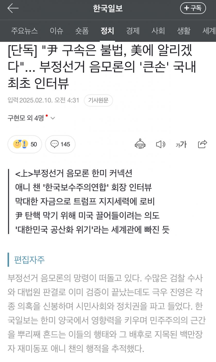 | Subject | "尹 구속은 불법, 美에 알리겠다"... 부정선거 음모론의 '큰손' 국내 최초 인터뷰 |