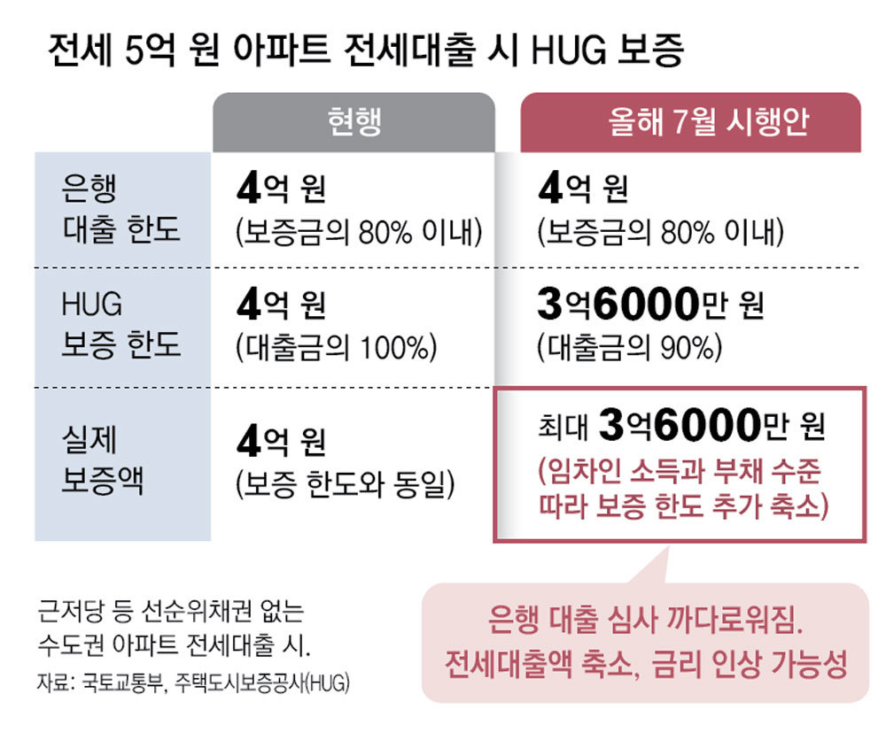예컨대 전세 5억 원짜리 수도권 아파트의 경우 세입자는 4억 원(전세 금액의 80%)까지 HUG 보증을 통해 전세대출을 받을 수 있었다. 하지만 HUG 보증 한도가 대출액의 100%에서 90%로 낮아지면서 HUG 보증을 통한 대출 가능 액수가 3억6000만 원으로 축소된다. 여기에 더해 하반기부터 세입자의 소득과 대출 등을 평가해 소득 대비 기존 대출이 과도한 경우 보증 한도는 3억6000만 원보다 더 줄게 된다. HUG 보증한도를 초과한 대출액은 은행이 리스크를 부담해야 한다. 이렇게 되면 은행 대출 심사가 깐깐해지고 대출액이 줄거나 금리가 오를 수 있다.