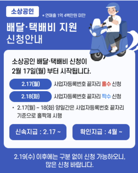 https://www.yna.co.kr/view/AKR20250208002500030 좀 지난 뉴스지만, 오늘부터 신청이라 소개합니다. 해당하는 분들은 신청하시기를. https://delivery.sbiz24.kr/ 0