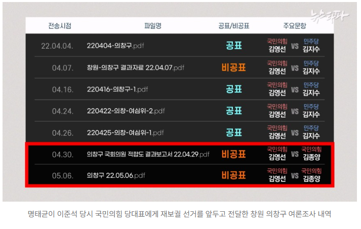 지난 해 11월, ‘이기는 여론조사를 가져오면 이준석이 공천을 주기로 했다’는 명태균씨의 육성이 공개되자 이준석 의원은 논리적으로 말이 안된다며 반박했다. 당시 [국민의힘이 확고한 우위를 점하는 창원·의창구 선거구]에서 ‘국민의힘 후보’인 김영선 전 의원이 ‘민주당 후보’를 앞서는 여론조사는 [전략 공천을 결정하는 데 아무런 근거도 될 수 없다]는 취지였다.