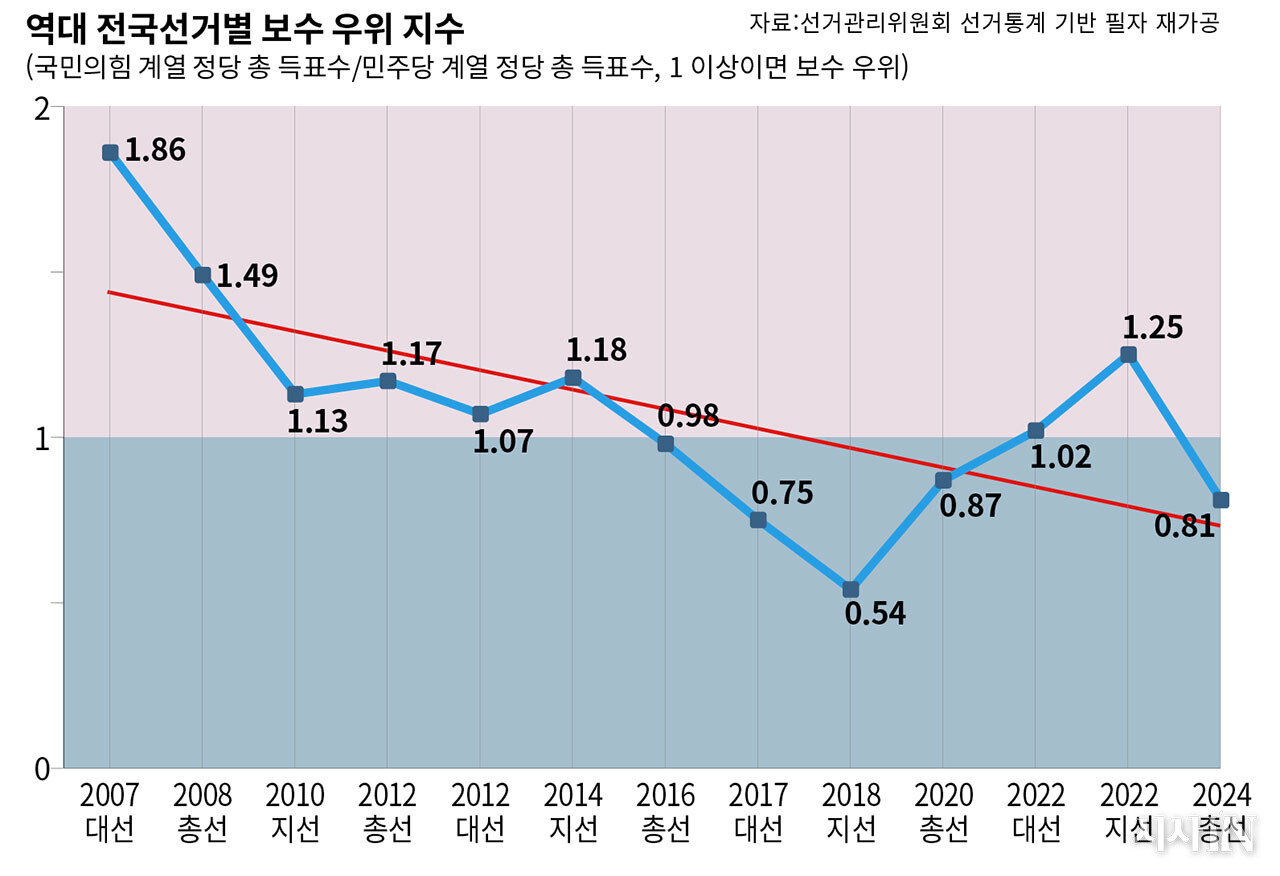 지수 1을 기준으로 위는 보수 우위, 아래는 진보 우위 선거다. 빨간색 선이 추세선이다. 오른쪽으로 갈수록 내려가는 게 보인다. 보수로 기울어진 운동장은 2007년 이후 10년 동안 점점 기울기가 완만해졌다가, 2016년 이후로는 방향이 뒤집힌다. 이제 운동장은 진보로 기울어 있다.