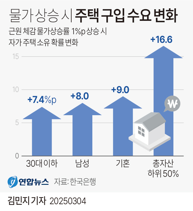 https://www.hani.co.kr/arti/economy/economy_general/1185207.html 한국은행 경제연구원이 4일 발표한 ‘인플레이션 경험이 주택 수요에 미치는 영향 분석’ 보고서를 보면, 물가의 기조적인 흐름을 보여주는 근원물가가 상승하면 주택을 소유하려는 가구가 늘어나는 것으로 분석됐다... 통상 인플레이션으로 화폐 가치가 하락하면 주택과 같은 실물자산에 돈이 몰리는 현상, 인플레이션 헤징이 나타난다... 인플레이션 헤징은 주로 △30대 이하 △남성 △기혼 △4인 이상 가족 △자산 하위층에서 두드러진 것으로 나타났다. 분석 결과, 경제 주체가 경험한 근원물가 수준(근원 경험 인플레이션)이 1%포인트 오를 때 ‘30대 이하’의 자가주택 소유 확률은 7.4%포인트 높아졌다. 근원 경험 인플레이션이 1%포인트 오를 때, 남성의 자가 주택 소유 확률은 8.0%포인트, 기혼은 9.0%포인트, 자산 하위층(4분위 중 1·2분위)은 16.6%포인트씩 각각 높아지는 것으로 분석됐다... [총자산이 작아 주택을 구입하기 쉽지 않은 가계일수록 인플레이션에 따른 집값 상승에 대비해 주택 구입 수요가 높아진다] 집에 절박할수록 집에 물리게 되는 이유... 0
