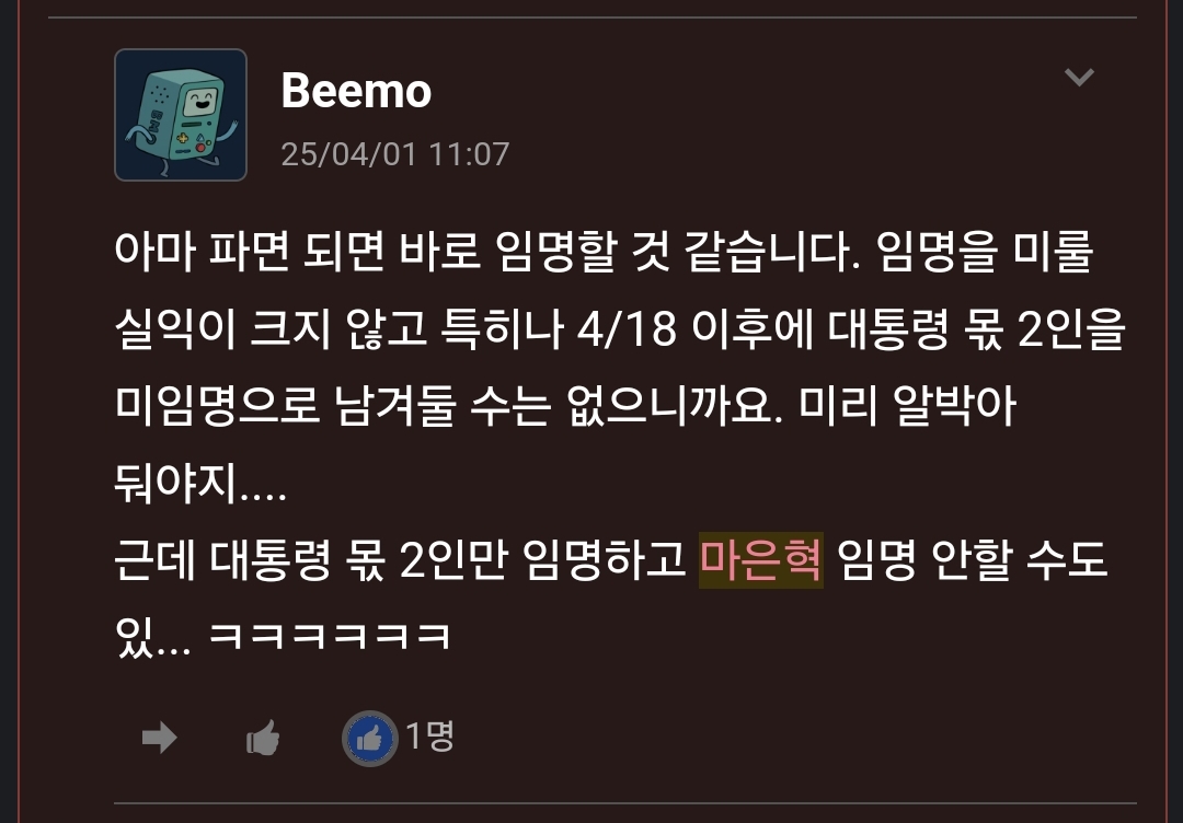 미친사람같네요. 상식을 좀 챙겨주면안되나.. 마은혁은 절대 임명안하고 시간끌고, 대통령몫은 바로 임명하고 이게 말이 됩니까. 차기 대선이 두달도안남았는데 민주적 정당성없는 권한대행이 알박기를??