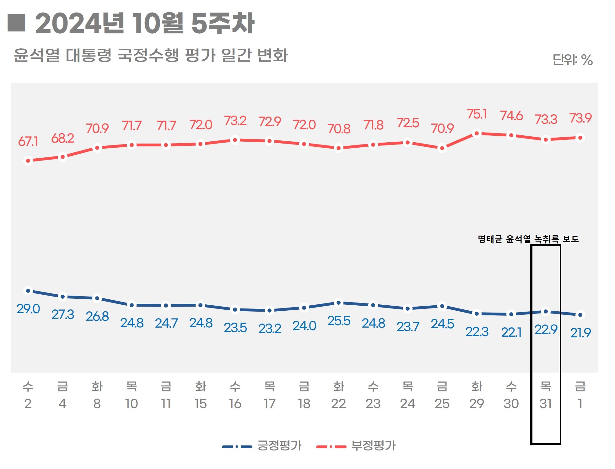 윤석열/명태균 녹취록이 공개된직후 목/금 지지율 평균 21.4