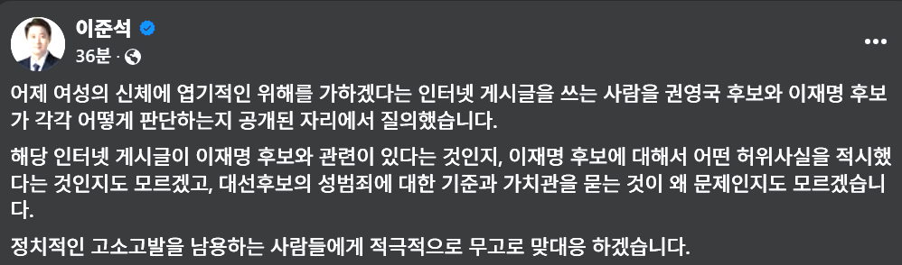 이준석 후보는 김문수 후보와 동일하게 정책과 비전보다