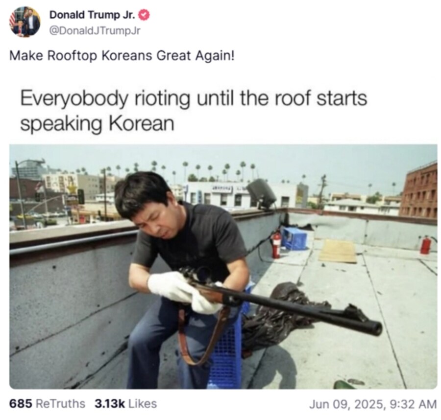 2475 국제트럼프 장남 "코리안 다시 위대하게"…33년전 LA폭동 사진 소환 왜 7 활활태워라 25/06/09 2561 1