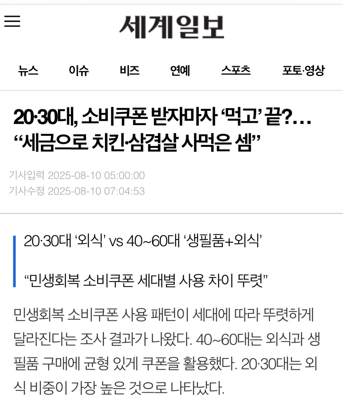경제20·30대, 소비쿠폰 받자마자 ‘먹고’ 끝?…“세금으로 치킨·삼겹살 사먹은 셈” 16 |