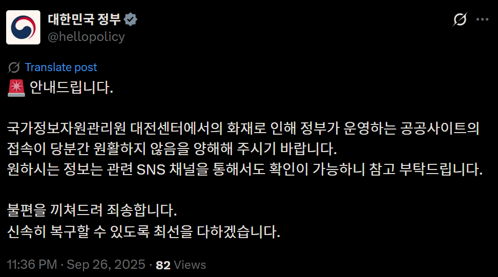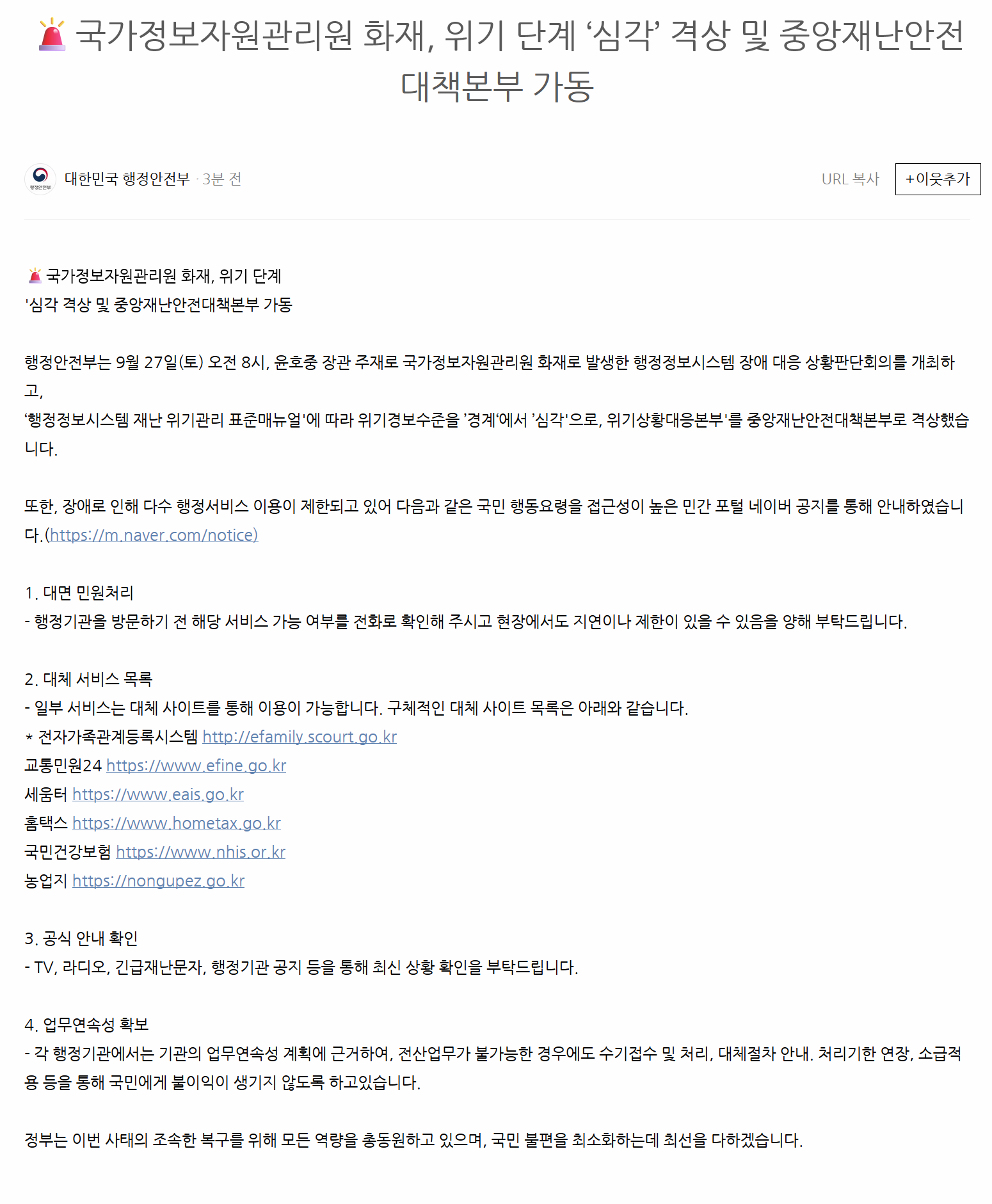 사회중앙부처·공무원 업무시스템 모두 탔다…"재가동까지 2주 관측" 12 |