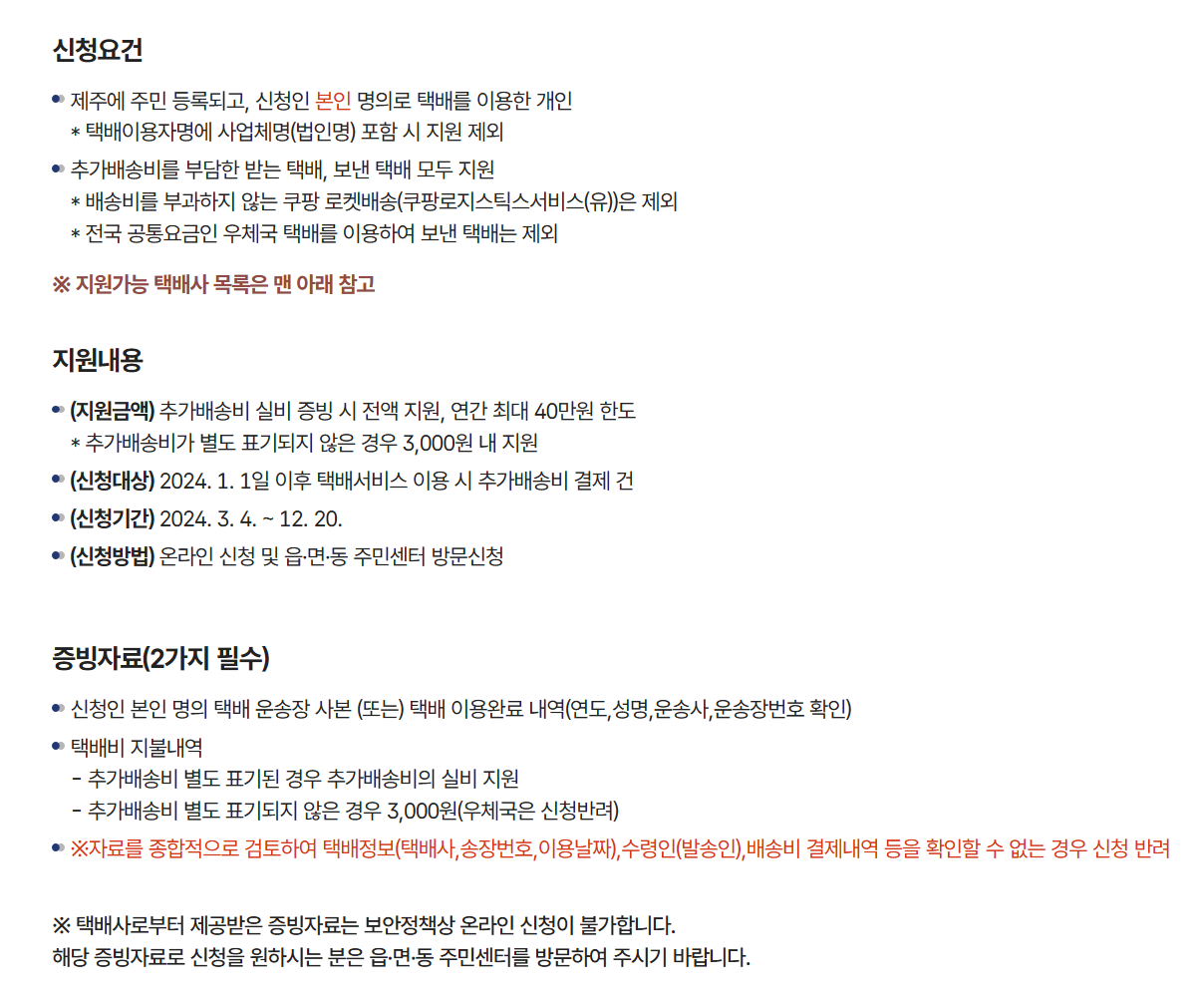 홍차넷 탐라가 제주도 얘기인 줄 알았던 시절이 있습니다. 홍차넷에도 제주 도민분들이 계시던데, 옛날에는 이마트가 최선일 정도로 육지 대비 공산품이 다양하지 않은 게 장기 거주 시 불편했는데, 요즘은 쿠팡도 되더군요. 작년부터 택배 추가배송비 1인당 연 40만원까지 지원되고 있습니다. 자동으로 되는 것은 아니고, 신청을 해야 하는군요.