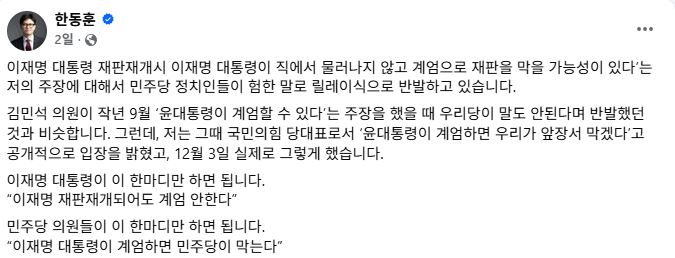 Subject   한동훈 “이재명 대통령, 재판 재개하면 계엄령 발동할 것”