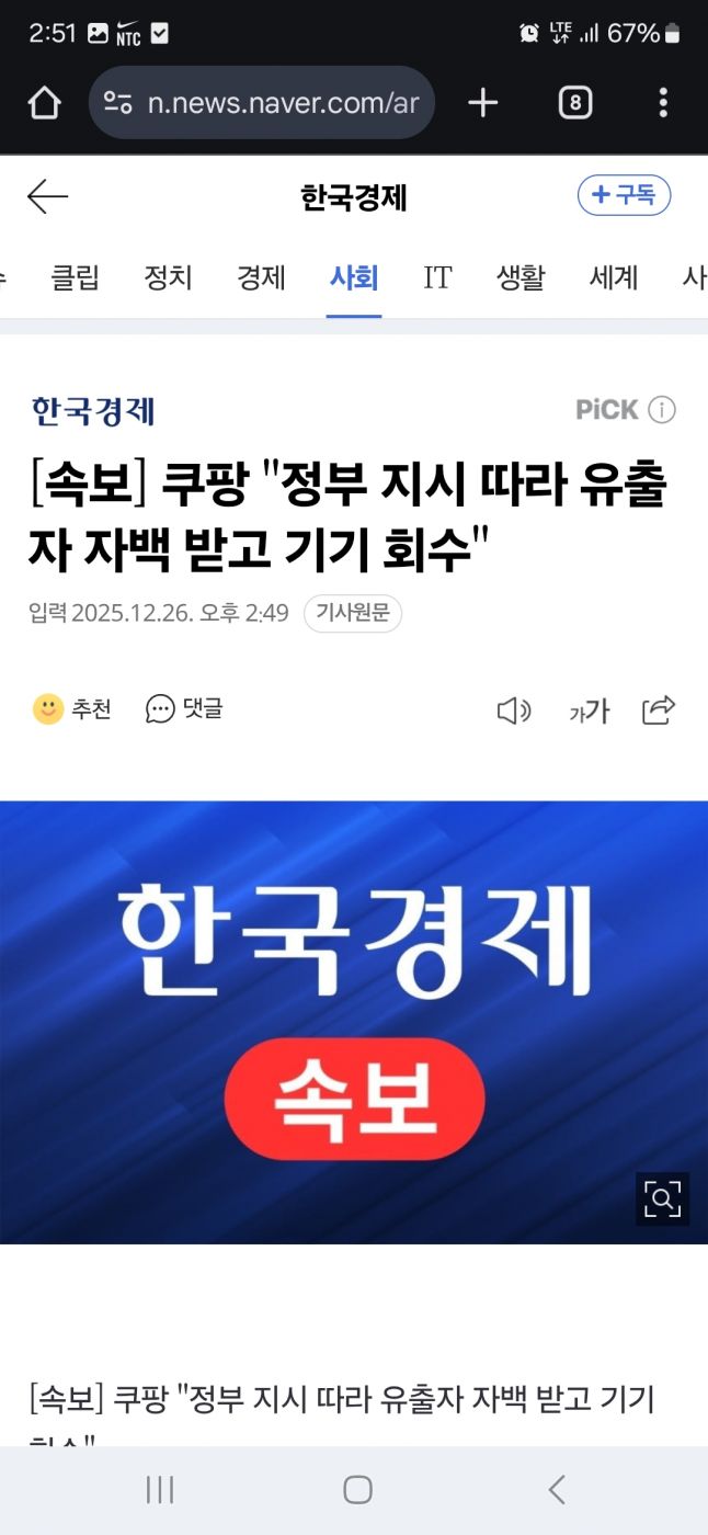 26일 쿠팡에서 정부 지시따라 유출자 자백 받고 기기 회수라는 속보가...