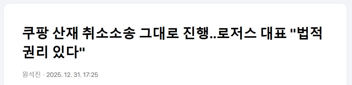 https://www.newsis.com/view/NISX20260104_0003464371 일이 이렇게 커지게 된 건 쿠팡이 산재에 대해서 크고 굵직한 건 불복 소송을 걸어서 산재 피해자들을 고립시키고 주변과 차단해서 싼 값에 합의를 이끌어내 자기들에게 이익이 되게끔 계속 유도를 해온게 먹혔기 때문인데 이번에는 곱게 넘어가지 못할 거 같습니다. https://youtu.be/KV1TSrZdwmM?si=DLo1IA4RYDaNmbzf 2