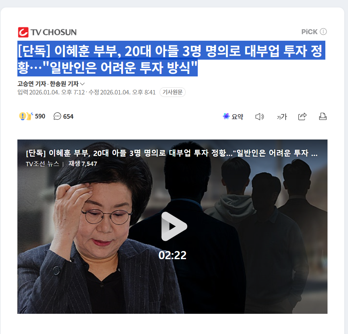 Subject   이혜훈 부부, 20대 아들 3명 명의로 대부업 투자 정황…"일반인은 어려운 투자 방식"