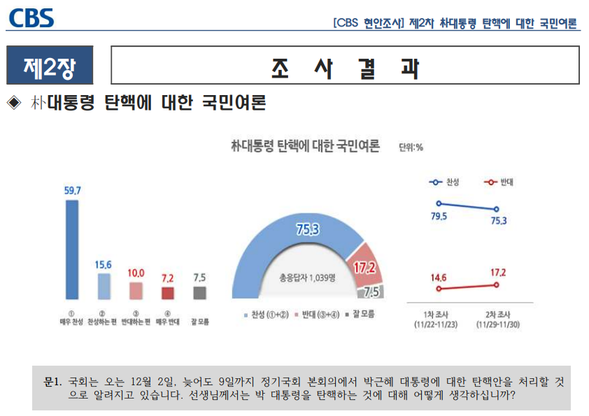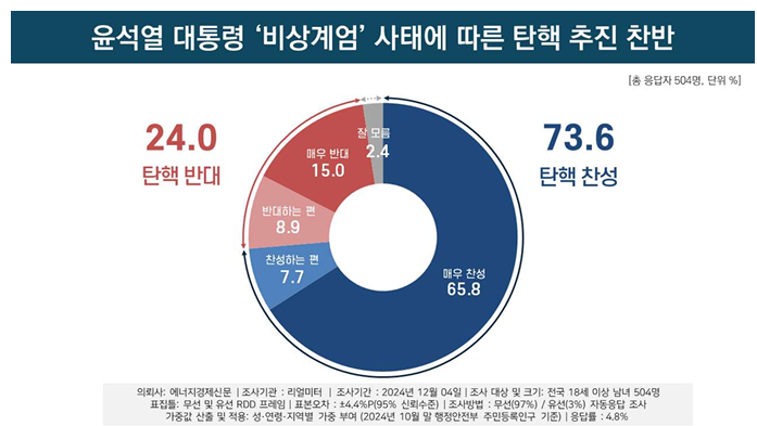 5일 여론조사업체 리얼미터가 공개한 여론조사(에너지경제신문 의뢰로 4일 전국 18세 이상 남녀 504명 대상으로 무선 97% 유선 3% RDD ARS 자동응답으로 조사. 표본오차는 95% 신뢰수준에 ±4.4%포인트. 응답률은 4.8%)에 따르면 윤 대통령 탄핵에 대해 73.6%가 찬성하는 것으로 조사됐다. 탄핵에 반대한다는 의견은 24.0%였다.