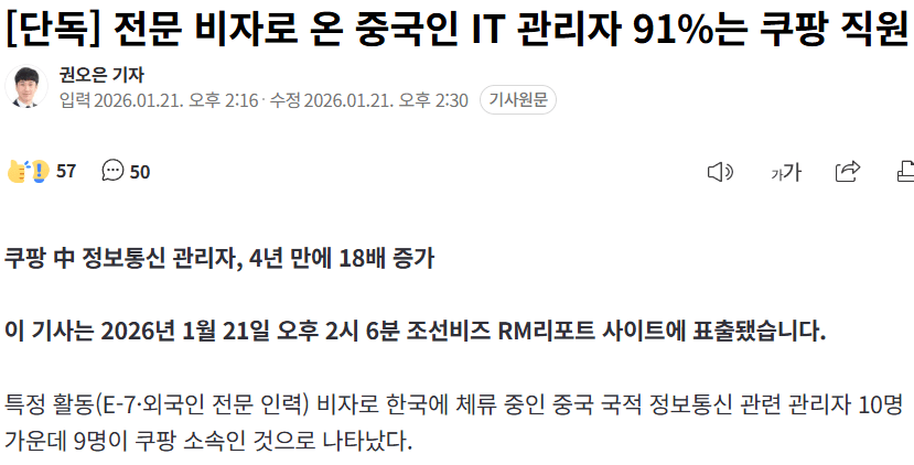 Subject   전문 비자로 온 중국인 IT 관리자 91%는 쿠팡 직원