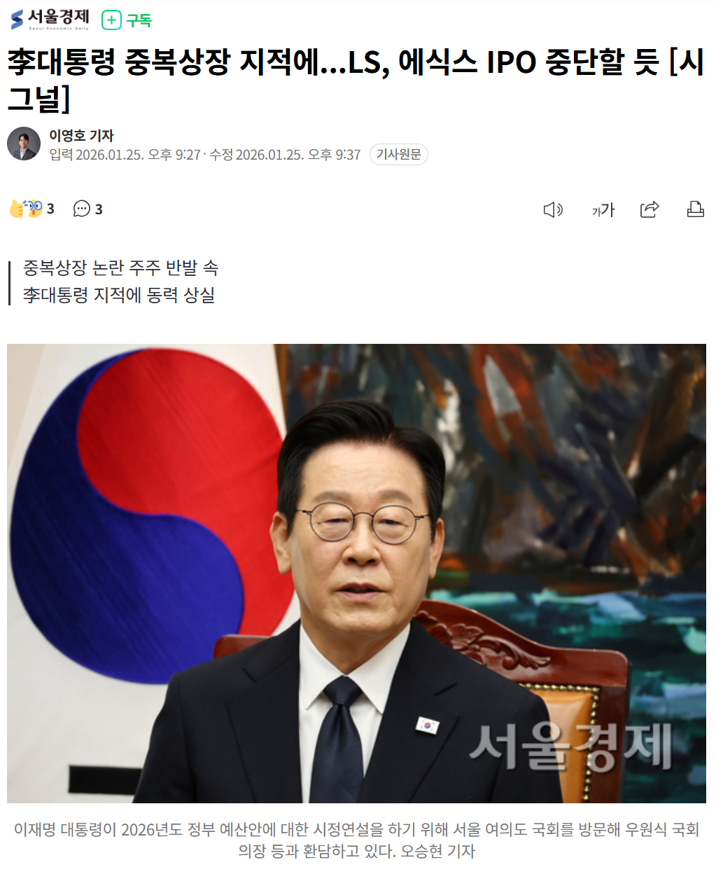 LS가 에식스솔루션즈의 기업공개(IPO)를 중단할 것으로 보인다. 중복상장 논란으로 주주들이 반발하는 가운데 이재명 대통령이 이를 지적한 영향으로 해석된다.