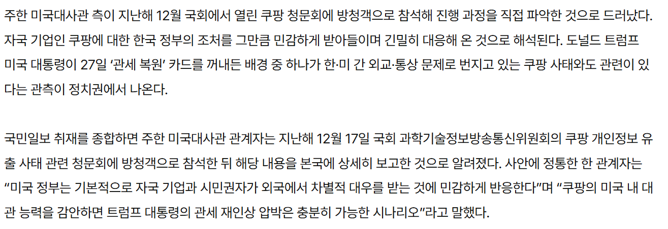 Subject   단독] ‘쿠팡 관련설’ 사실일까… 미 대사관, 쿠팡 청문회 방청 후 본국 보고