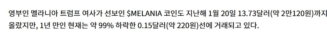 국제밈코인 열풍 꺼지자…트럼프 코인 1년새 93% 폭락 1 + |