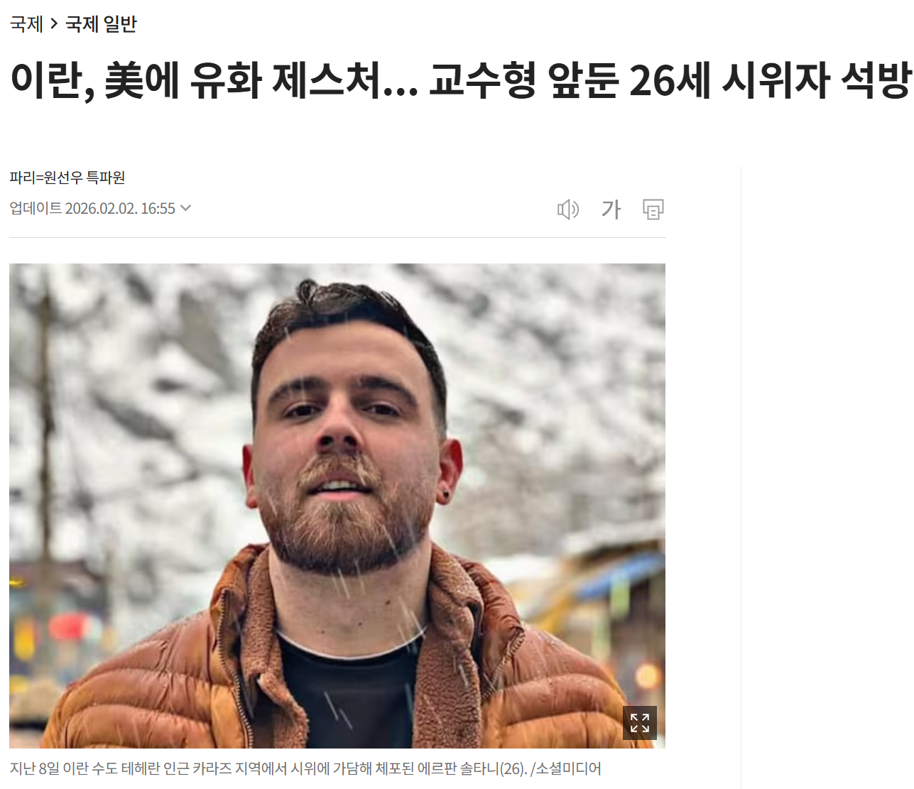 이란 반정부 시위에 참여했다는 이유로 교수형을 선고받았던 에르판 솔타니(26)가 보석으로 석방됐다. 이란은 최근 미국의 강력한 군사적 압박에 대외적으로는 ‘결사 항전’ 의지를 밝히고 있지만 물밑 외교 협상도 계속하고 있다. 도널드 트럼프 미 대통령이 직접 “처형한다면 강력한 조치를 취하겠다”고 한 솔타니 석방은 이란의 대미 유화 제스처라는 평가가 나온다.