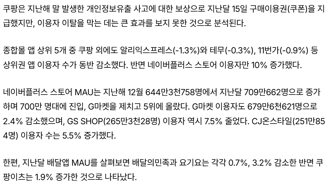 | Subject | 쿠팡, 개인정보 유출 후폭풍…1월 이용자 110만 명 '탈팡' |