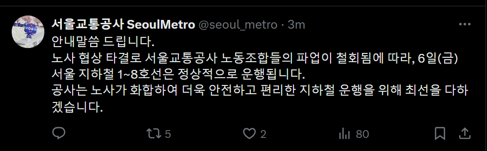 서울지하철(1~8) 파업은 철회되었다고 합니다.
