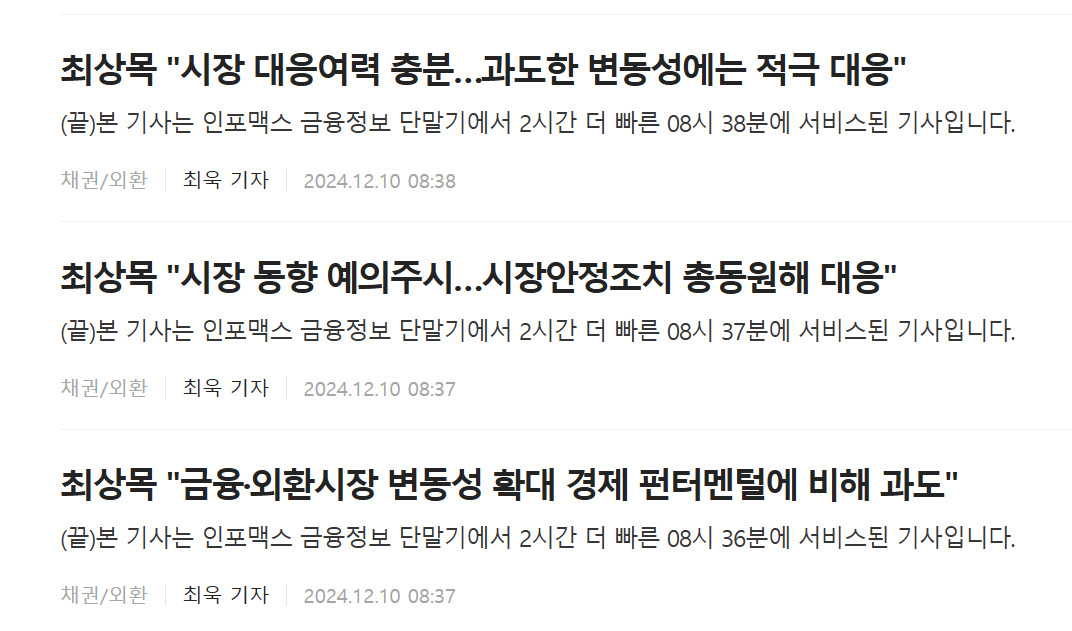 https://www.yna.co.kr/view/AKR20241209147200002 불확실성은 빨리 제거해야 하는데. 골드만 삭스에서는 어제 정확한 시간/기간이나 구체적인 방식 등이 명확해질 필요가 있다면서도 소위 '질서 있는 퇴진'과 조기 대선이 가장 가능성 높은 시나리오라고 했습니다. 하지만, 어디로 튈지 모르는 내란수괴 윤을 대통령으로 여전히 두고 있는 국민 입장에서는 당장 하야 안 하면 탄핵 외에는 못 기다릴 것 같습니다. 오늘 오전에는 기재부 장관이 구두 개입을 했습니다. 0
