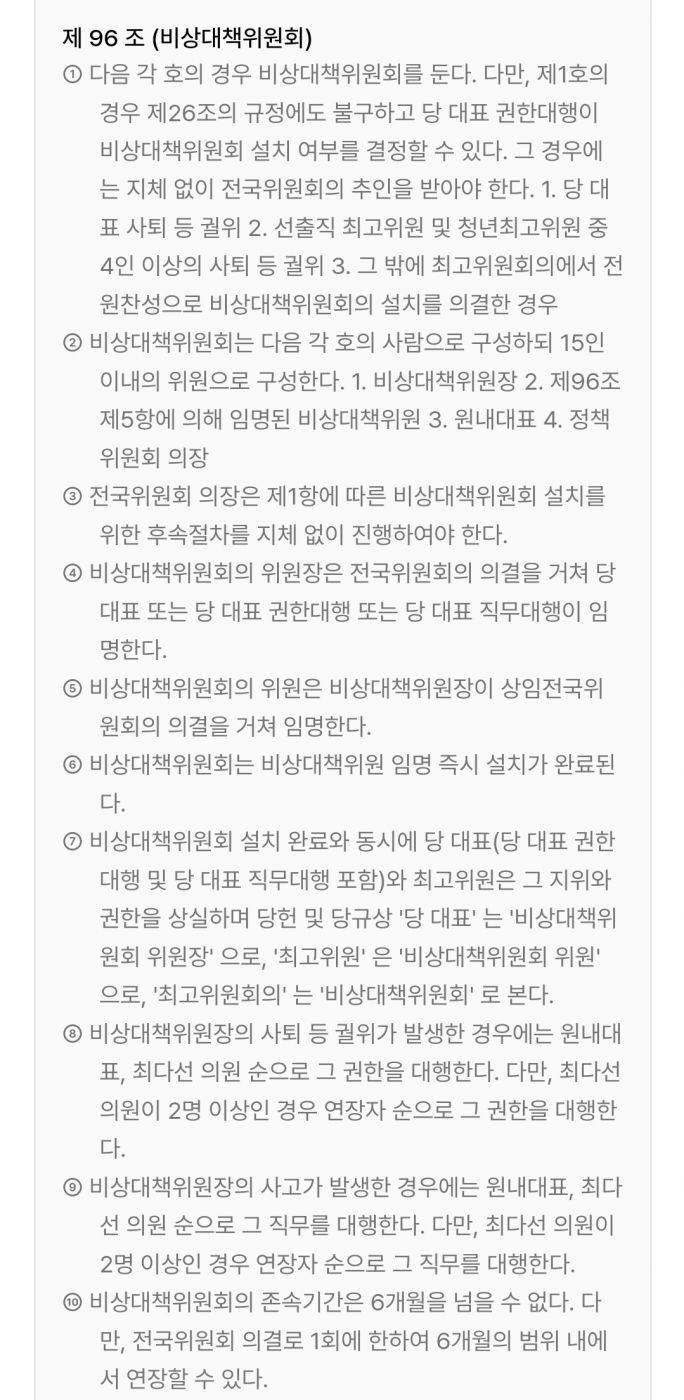 https://naver.me/F2ZsGEYD 친한동훈(친한)계인 박상수 국민의힘 대변인은 이날 사회관계망서비스(SNS)에 “당헌 제96조 제1항은 비대위 구성 요건을 두고 있으며, 제4항은 비대위원장은 당대표 또는 당대표 권한대행이 임명하는 것으로 규정하고 있다”면서 “최고위원 4인 사퇴는 당대표 권한대행 또는 직무대행 발동 요건이 아니라 비대위 구성 요건이며, 이에 비대위원장 임명 권한으로 당대표를 두고 있는 것”이라고 밝혔다. 그는 이어 “당대표는 아직 사퇴하지 않았으므로 당대표 권한대행은 성립될 수 없다”며 “당헌 상 당대표 권한대행은 당대표 사퇴나 궐위시 가능하다”고 했다. 이날 장동혁·김재원·인요한·김민전·진종오 최고위원이 모두 사의를 표하면서 당헌에 따라 비대위 전환이 예고됐는데, 한 대표가 사퇴하지 않는 한 비대위원장 임명 권한이 한 대표에게 있다고 주장한 것이다 ==== 추훈이형.. 동해요.. 내년중으로 위헌정당 맞아 해산 당할 당에 재신이 많긴 많은가 봅니다. 0