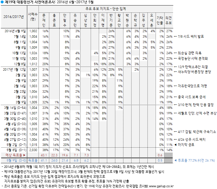 그 당시 문재인 후보가 현시점에서 선호되던 비율(31%, 탄핵소추안의결시점) 보다도 현재 이재명 당대표가 선호되는 비율(37%)이 더 높은게 눈에 띄이는군요.