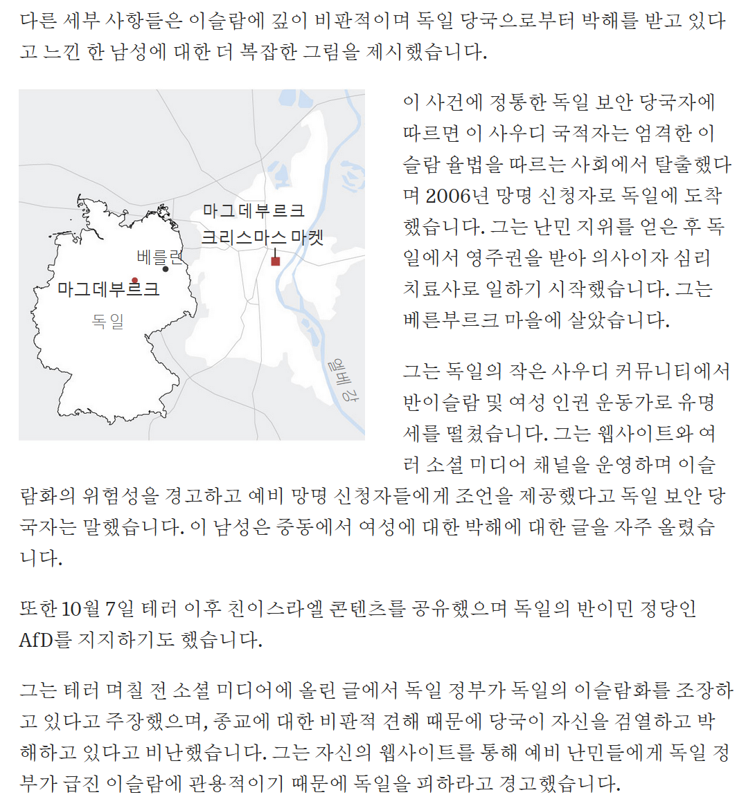 요즘 일론 머스크가 유럽과 영국에도 극우 정당/정치인 지지 글을 날리고 있는데, 이번 테러 용의자는 극우 정당(AfD) 지지자였다는 보도가 있네요.  반이슬람 + 여성 인권 운동가인 심리치료사 겸 의사라고?