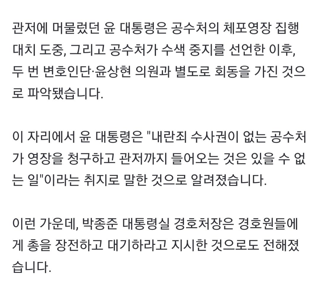 [단독] 윤 대통령 "공수처 체포영장 있을 수 없는 일…사법 체계 무너진다" https://www.mbn.co.kr/news/politics/5085432 [박종준 대통령실 경호처장은 경호원들에게 총을 장전하고 대기하라고 지시한 것으로도 전해졌습니다.] 내란을 피흘림없이 진압할수 있다는 생각이 너무 나이브한걸지도 모르겠습니다. 다음번엔, 경찰이 무력 사용을 예고하고 총을 쏘면서 진압하는 방법을 고려해야합니다. 1
