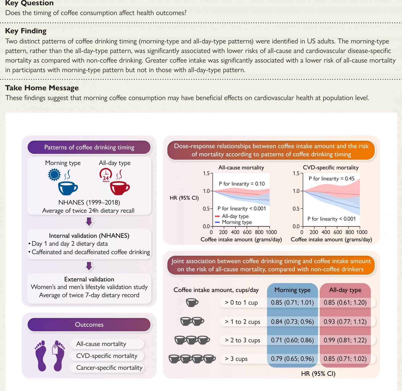 결론부터 말하면 커피를 마시지 않거나, 하루 종일 커피를 마시는 사람들보다 모닝커피만 즐기는 사람들이 전체적인 조기 사망 위험 및 심혈관 질환으로 인한 사망 위험이 낮았다.