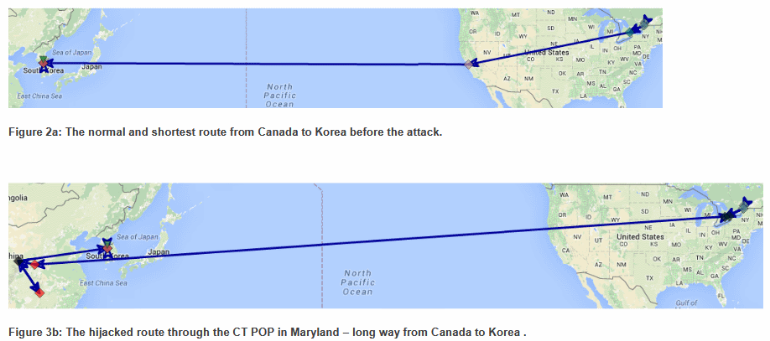 중국이 그동안 서구권 국가 사이에서 오간 인터넷 트래픽을 중간에서 가로채고 있었다는 사실이 미국과 이스라엘의 공동연구로 밝혀졌습니다. 첨부된 그림은 지난 2016년 2월부터 약 6개월간 캐나다 쪽에서 한국 정부에 접속을 시도할 때 중국 차이나텔레콤이 트래픽을 중간에서 가로채었었던 것(하단)을 정상 상태(상단)와 비교하여 도식화한 것입니다. 이렇게 트래픽을 가로채면 중간에서 오간 데이터를 엿볼 수가 있지요. 하여튼 중국 이놈들은 진짜 파도 파도 괴담만…