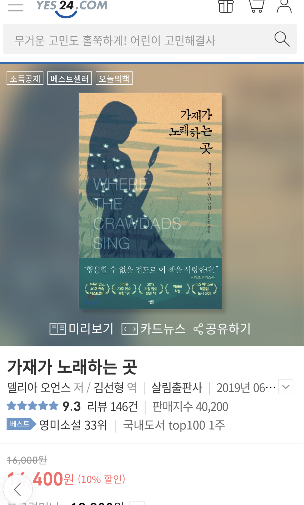 가재가 노래하는 곳 너무 재미있게 읽었는데 보니까 반갑네요 풀잎님 ㅎㅎ