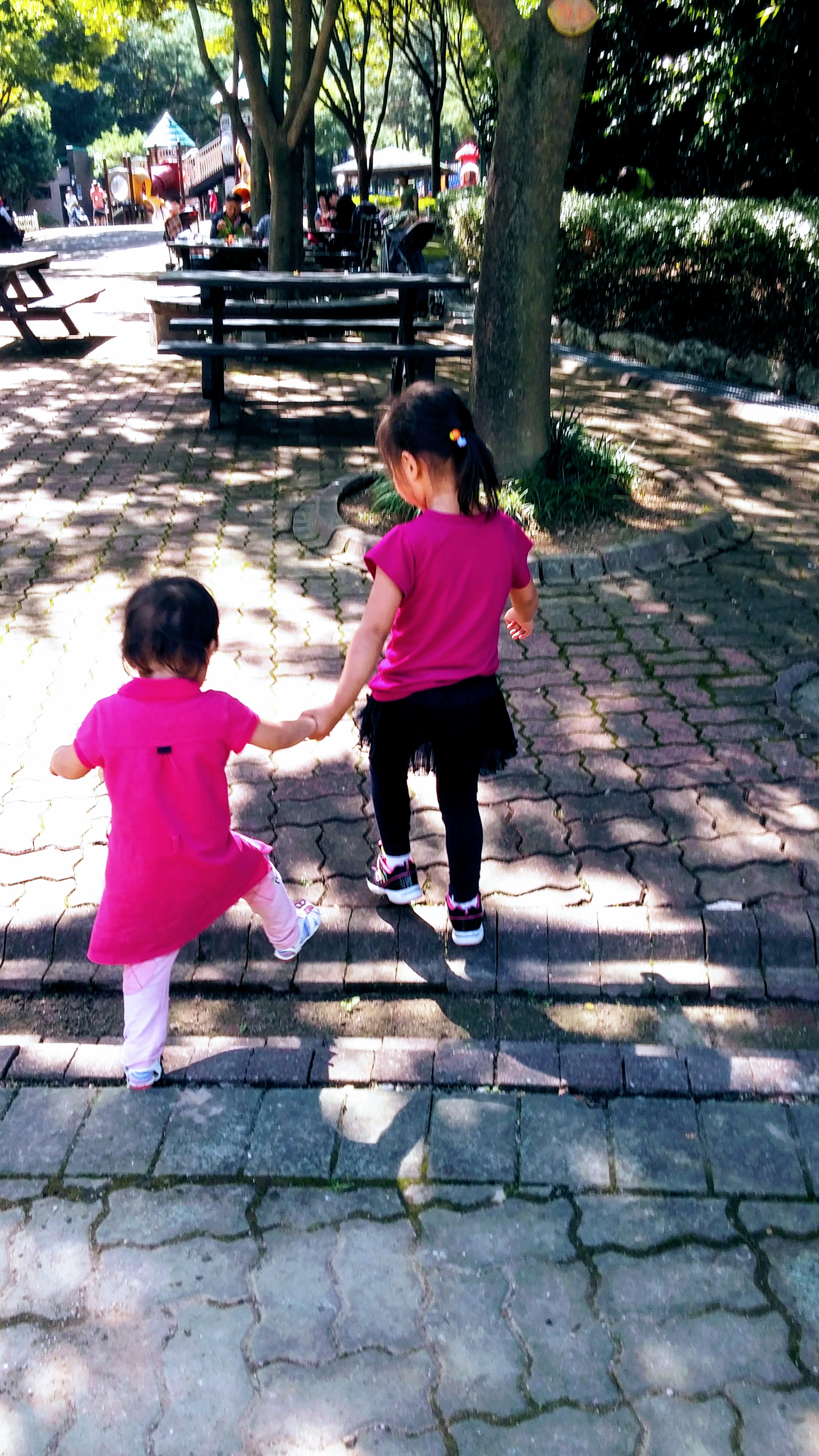 동생이 길 가운데 있는작은 홈을 건널 수 있도록  도와주는 언니 모습. G3.2015. 9.28.