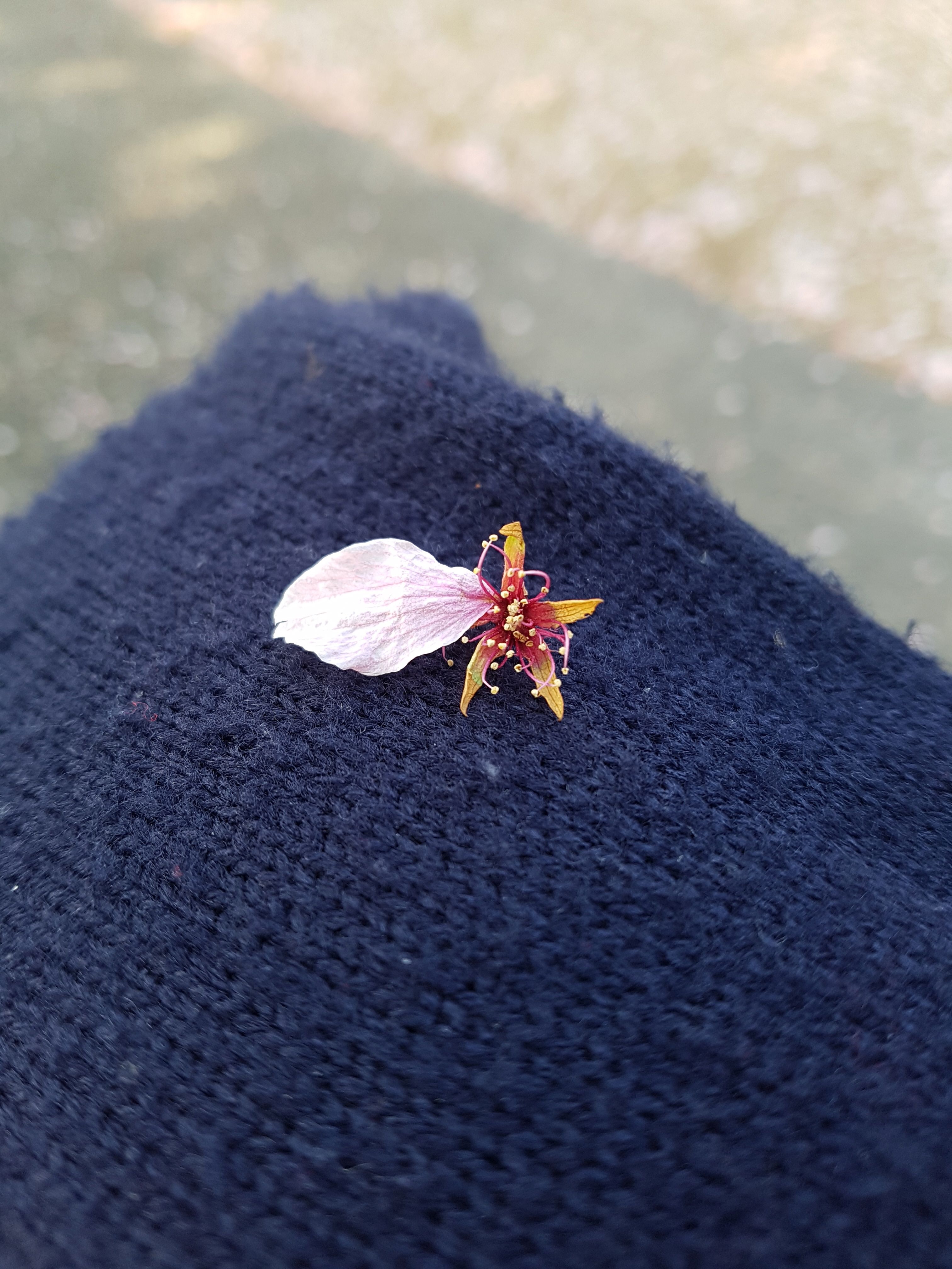 무릎위 올려둔 옷위에 내려앉은