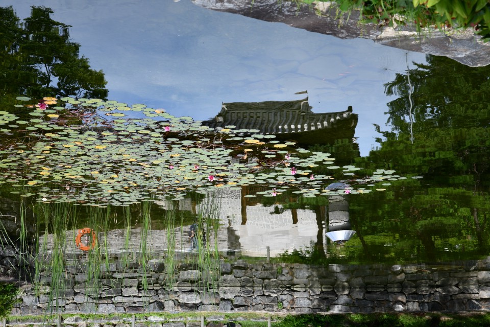 연못에 비친 건물과 국악당입니다.