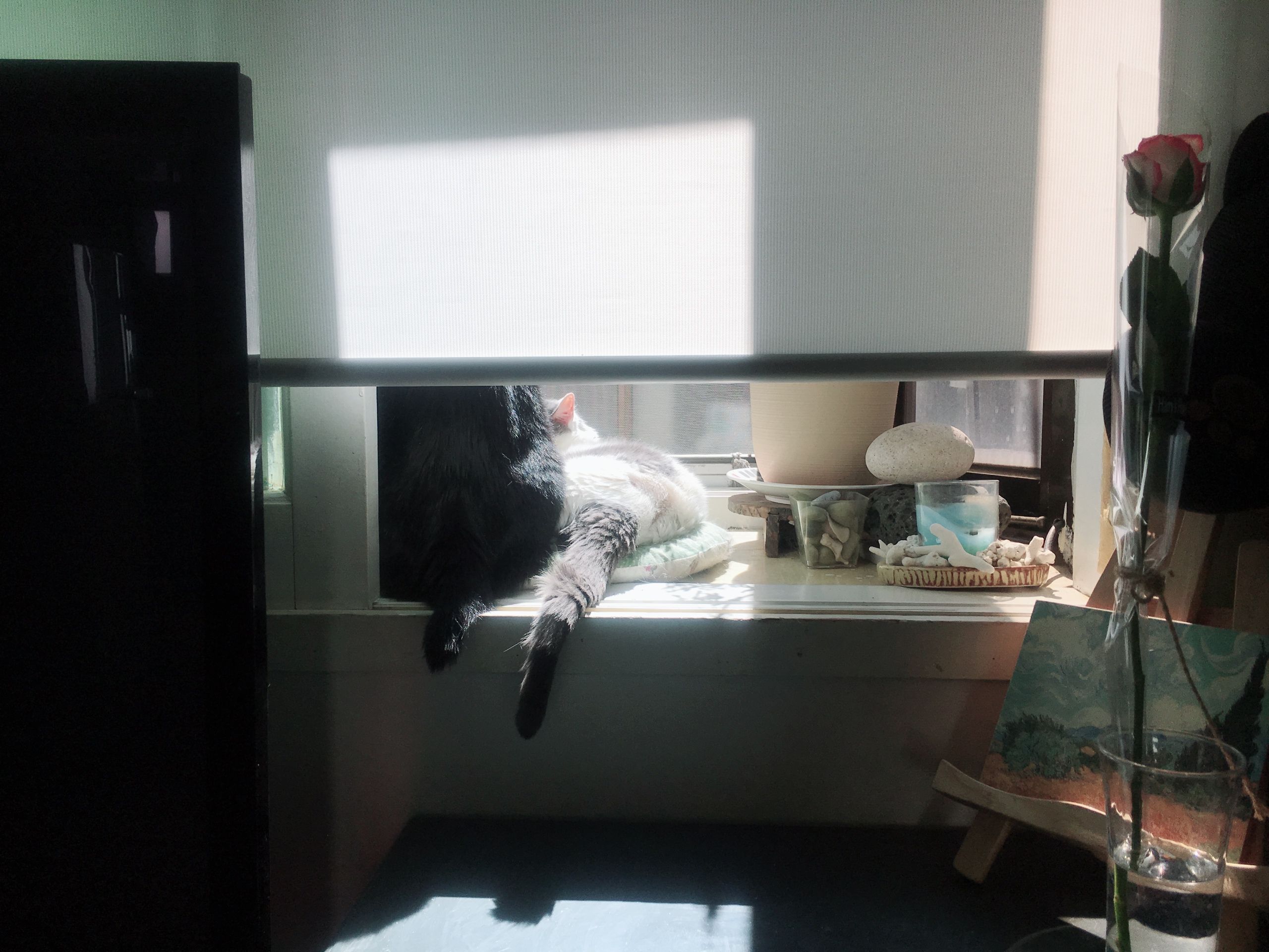 내가 공부하고 밥먹는 너른 테이블에 앉아있으면 저 창이 정면으로 보인다. 햇빛을 받으며 뜨끈뜨끈 낮잠을 즐기는 할아버지 고양이들.