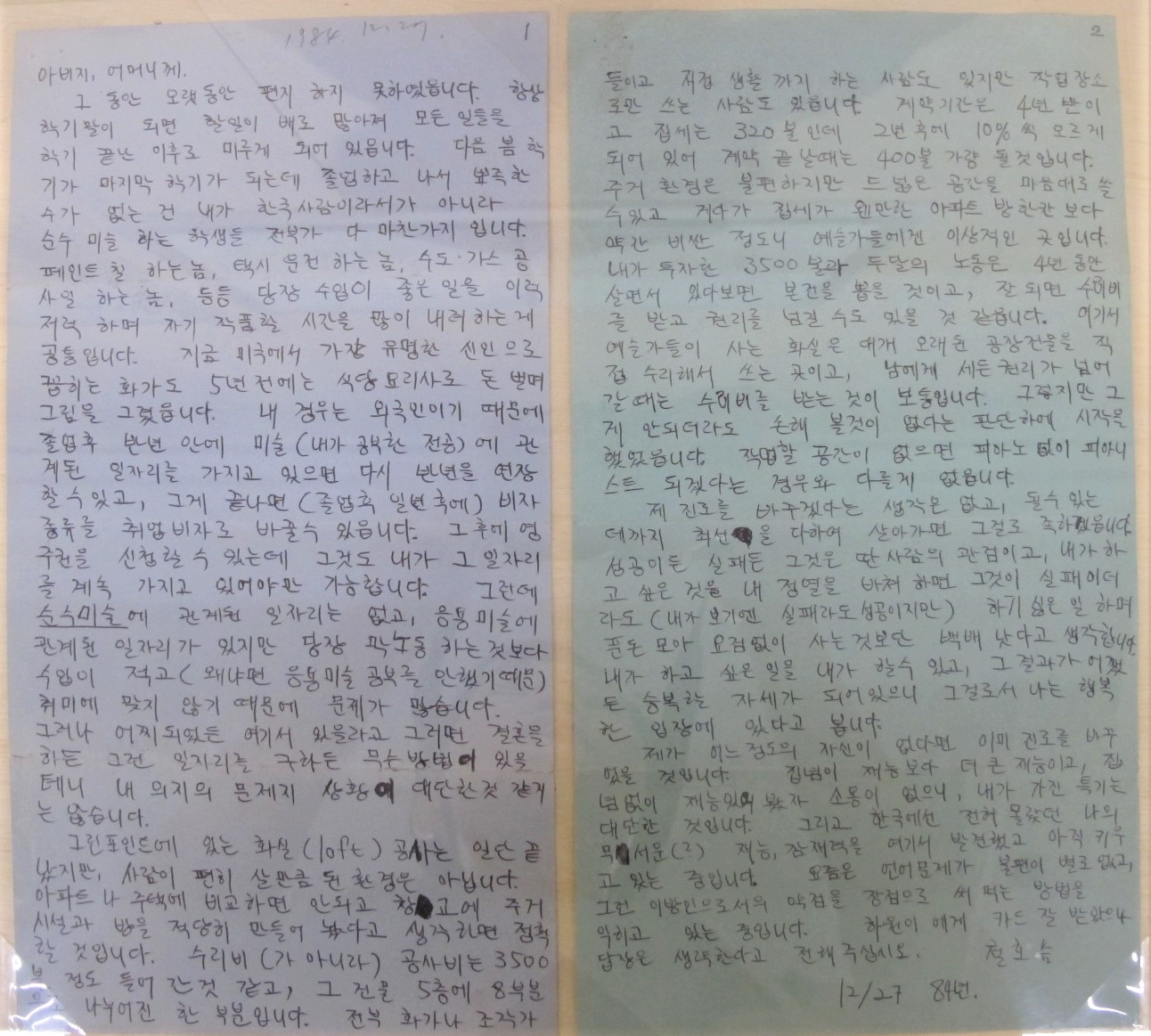 1) 뉴욕에서 학위 과정 중이던 박이소(박철호, 박모)가 부모님께 보낸 편지. 한 세대 전이나 지금이나. 2) 회화 북두팔성 (혹은 설치 팔방미인)에 관한 작가노트. 전시장에는 '북두팔성'과 직접 관련된 두 작품이 있는데, 박이소가 개념미술가라는 걸 염두에 둔다면 별 스티커를 이용한 작품이 원본이며 관련된 다른 작품들은 원본에 추가된 코멘터리임을 추정할 수 있다. 회화 북두팔성은 이 노트와 함께 감상하는 것이 작품을 가장 재미있게 보는 방법이었을 것이다. 5