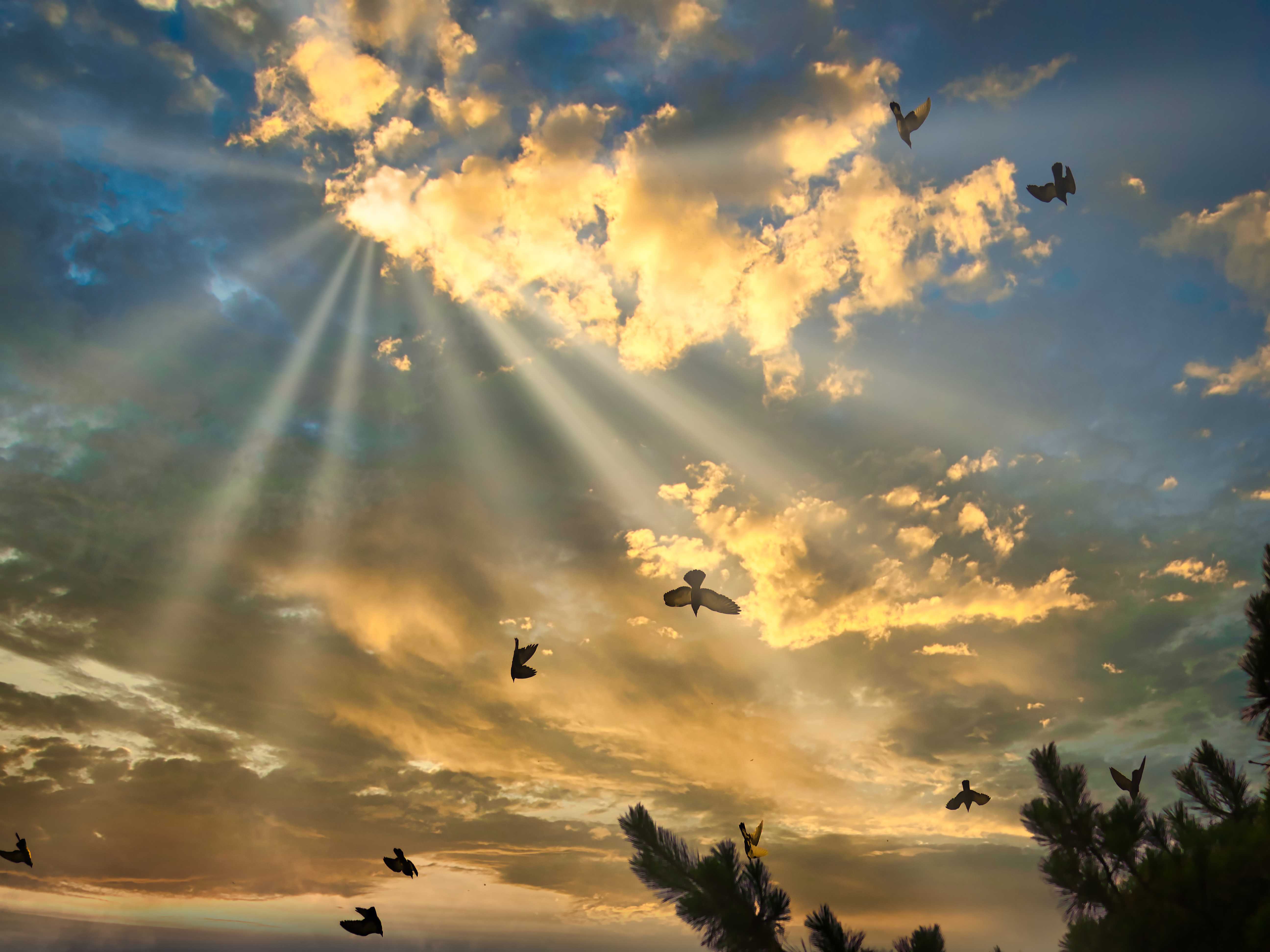 Subject   구름 사이로 햇빛이 나오는데 새떼가 막 날아가는 사진