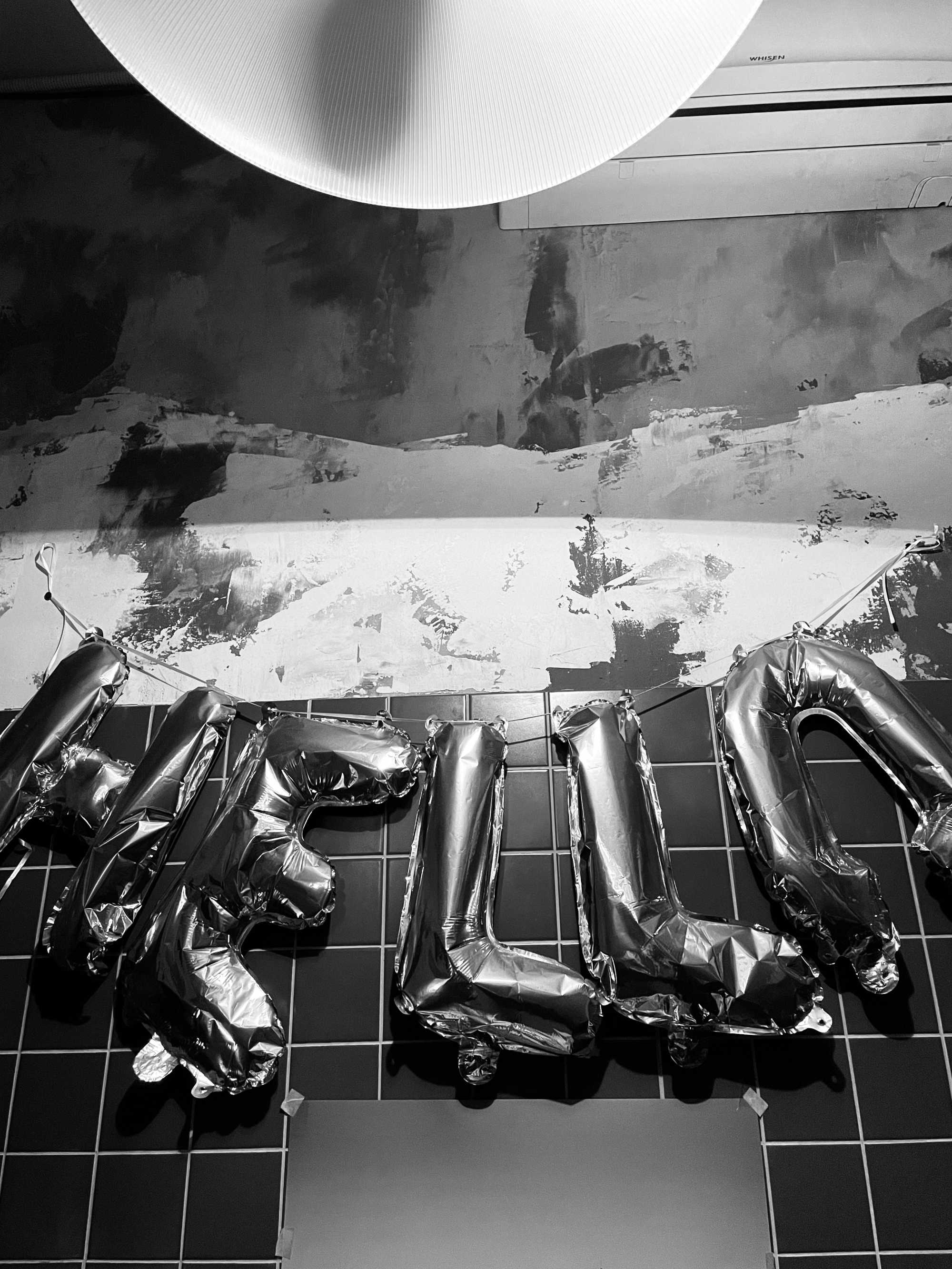 의도는 실내 비자연광 (백열등으로 보였음) 아래에서 비닐 풍선의 질감을 표현하는 것이었습니다...만