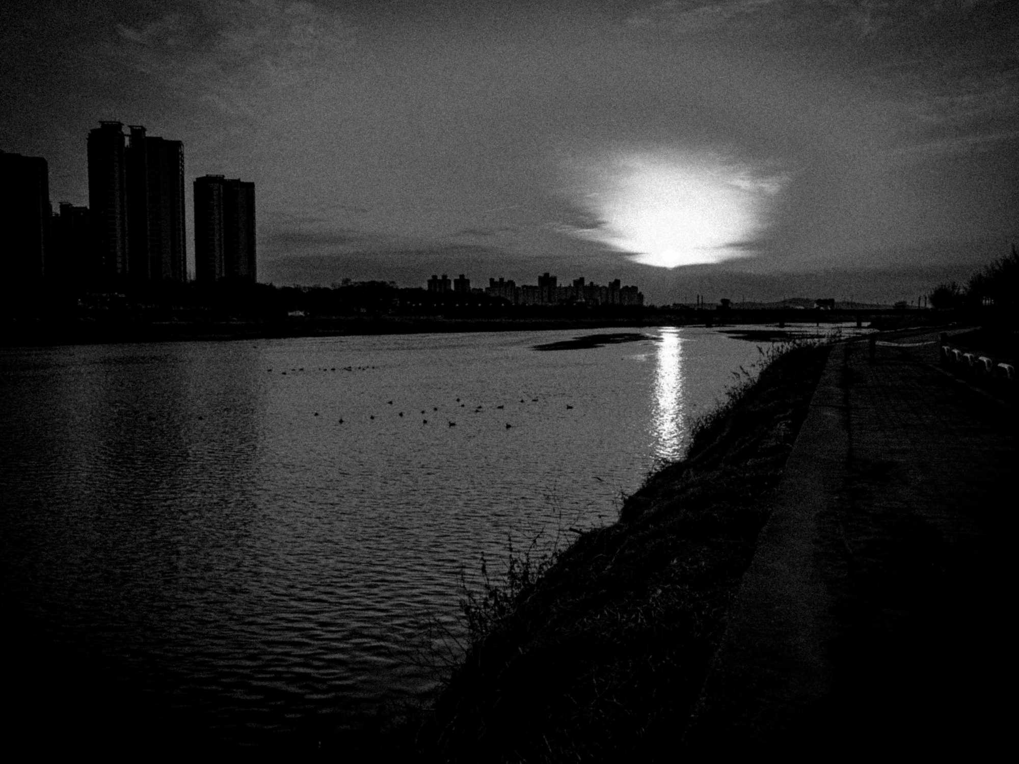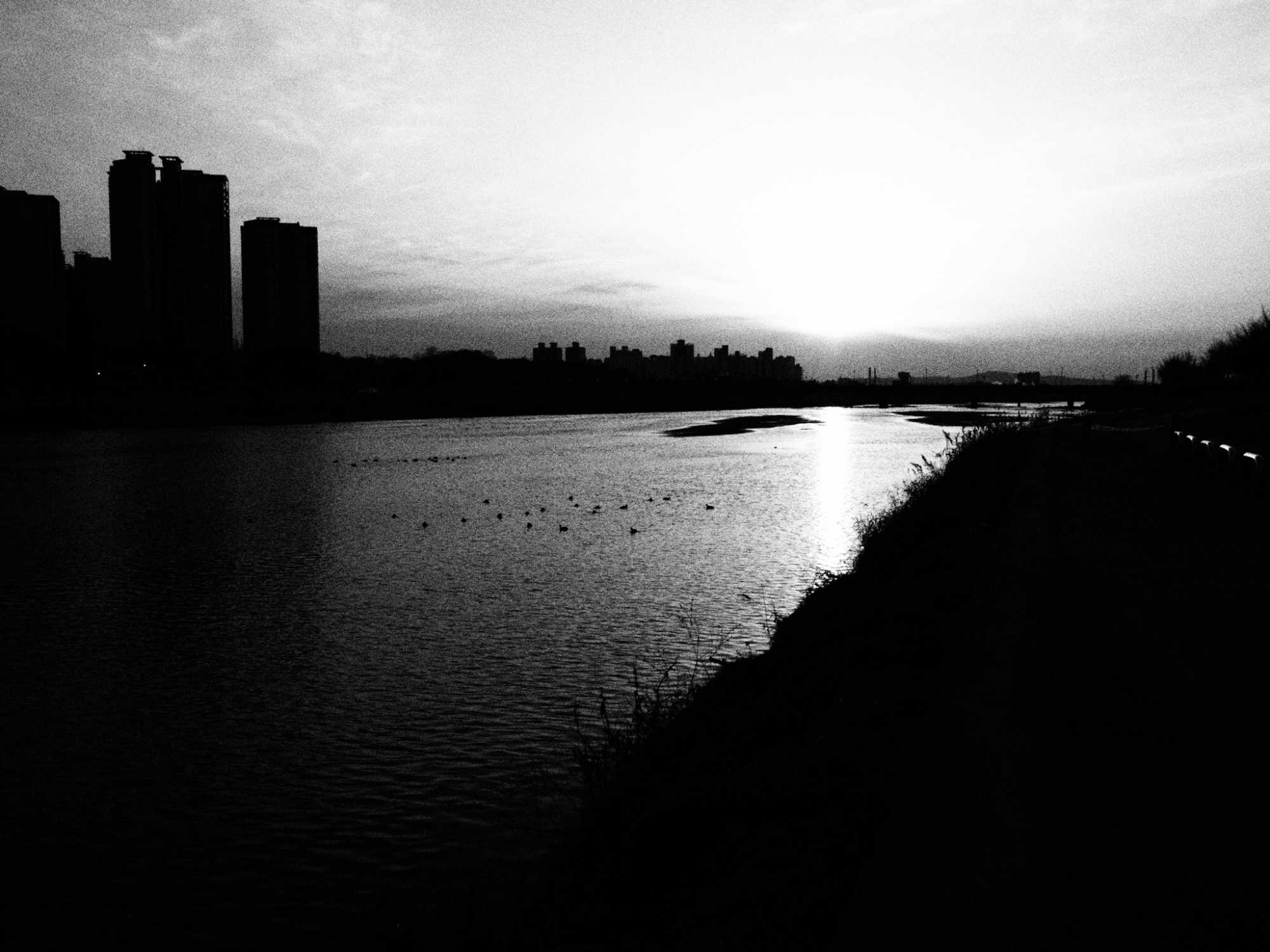 기술적 주안점: 올림푸스 카메라 내장 기능 중 아트필터 효과에서 흑백필름 필터가 있는데, 이를 이용해서 찍었을 때 (아래 사진) 그레인이 예쁘게 먹고 건물의 암부대비가 상승하는 이점이 있는 반면, 오른쪽 아래의 천변로가 잘 나오지 않는 점이 매우 아쉬웠습니다. 이를 최대한 보완하고 하얗게 날아간 하늘을 더 자세히 표현할 수 있도록 조절해보았습니다.