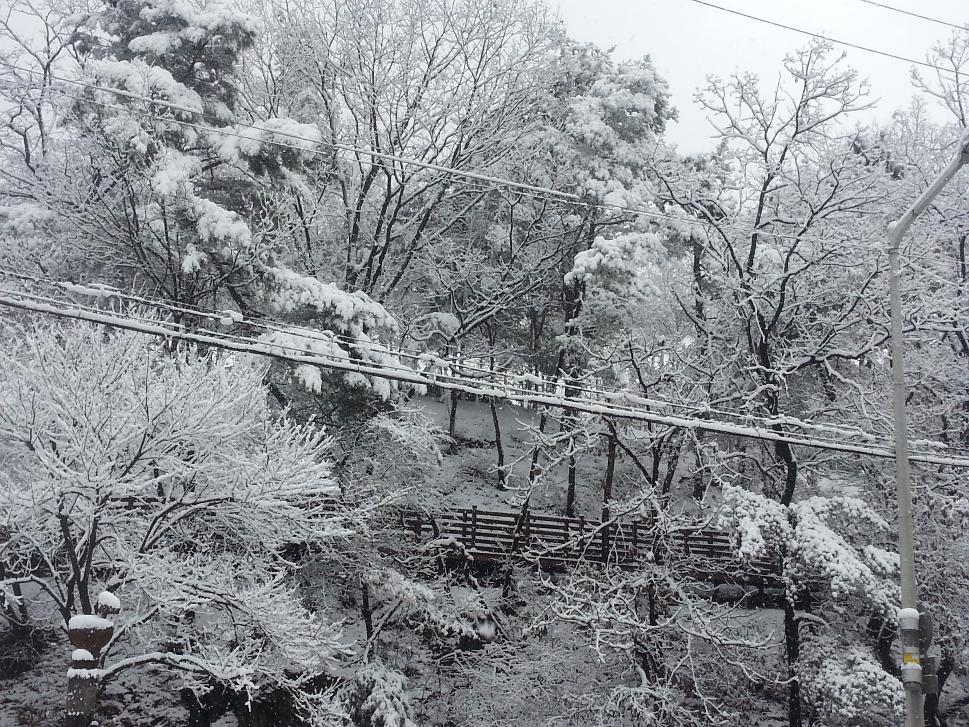 짚 앞 공원 나무들에 눈이 많이 쌓였네요.